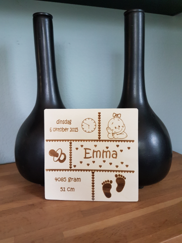Het geboortekaartje kan ook op het bord worden gegraveerd. Erg origineel!